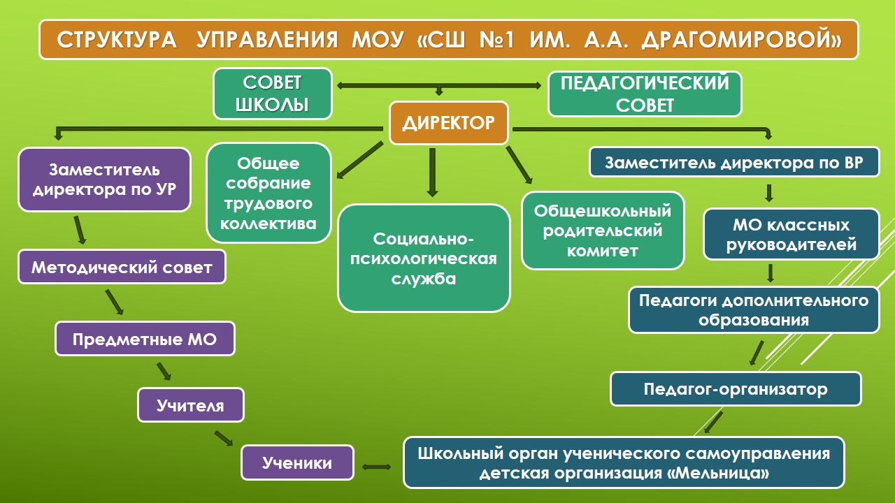 Коллегиальные органы управления (в соответствии с Уставом школы) : Совет школы, педагогический совет, общее собрание трудового коллектива, методический совет, малый педагогический совет.