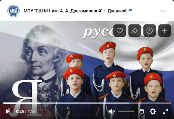 Кадеты Джанкойской школы №1 им. А.А. Драгомировой с композицией «Честь имею» в рамках Всекрымского конкурса музыкальных патриотических видеороликов. https://vk.com/school_1_dzhankoy?z=video-124993512_456239167%2Fb87f304a7f63be4963%2Fpl_post_-47249739_1174