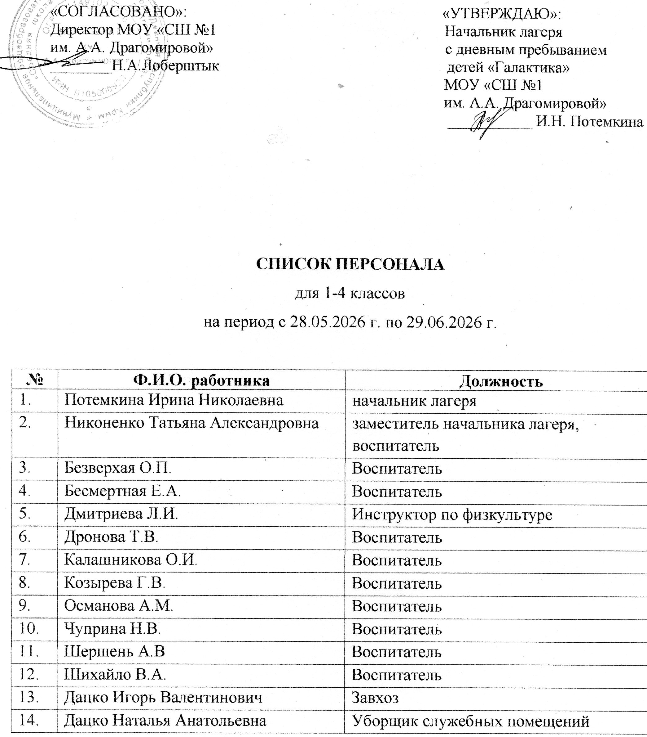 Фамилия, имя, отчество (при наличии) руководителя Организации отдыха либо индивидуального предпринимателя: Директор МОУ "СШ №1 им. А.А. Драгомировой" – Лоберштык Наталья Анатольевна |