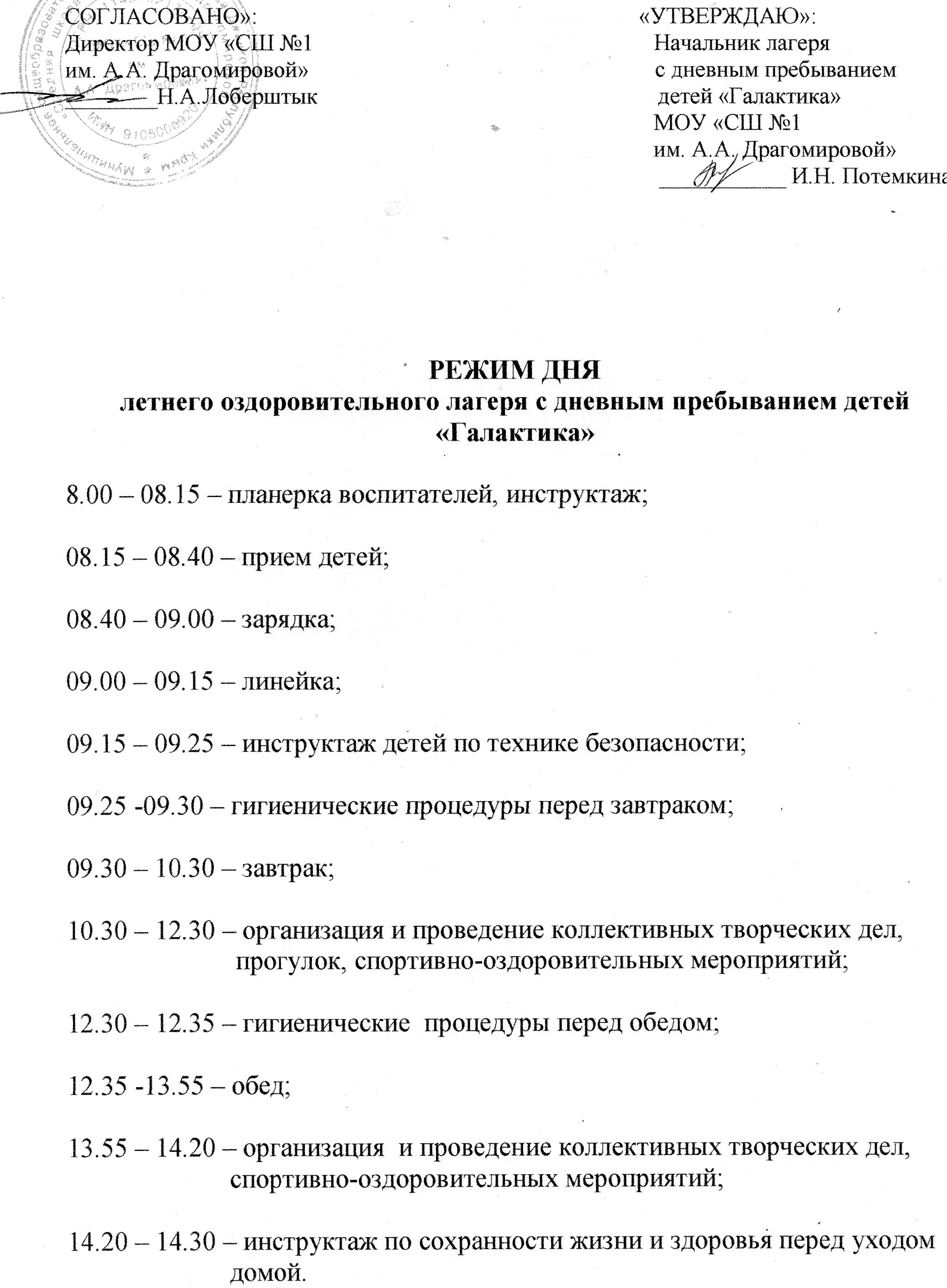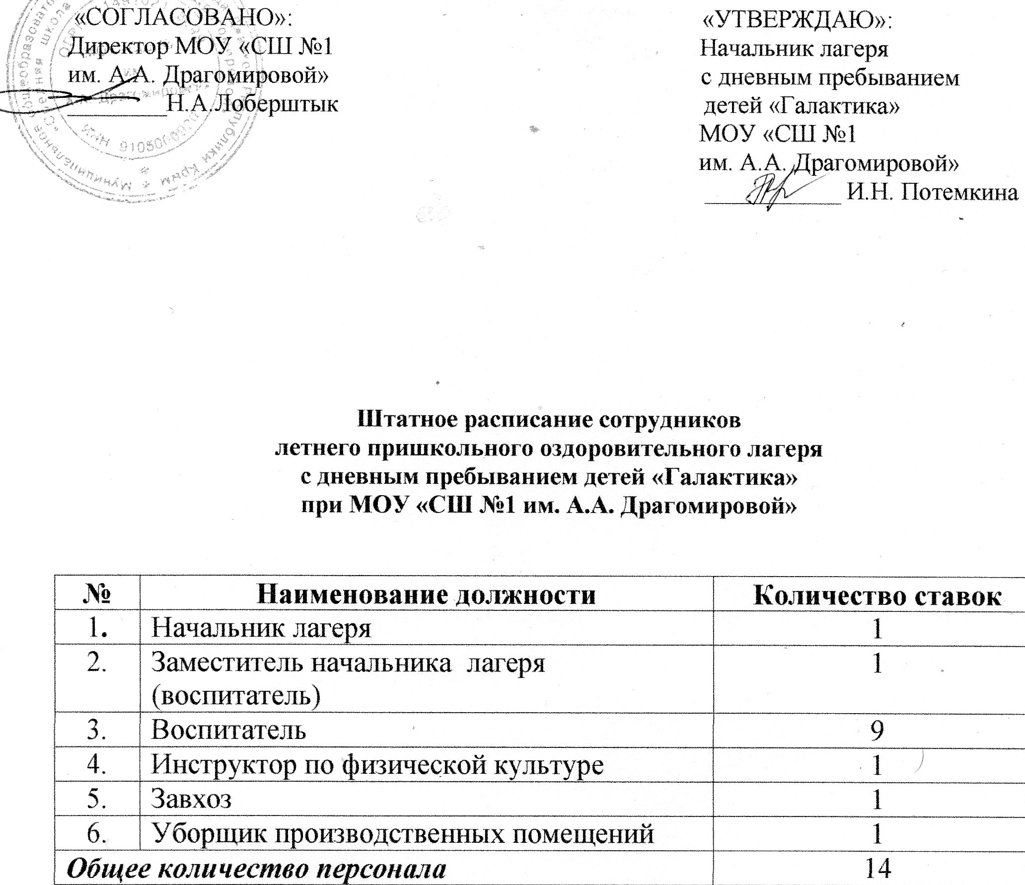 Фамилии, имена, отчества (при наличии) и наименования должностей руководителя Организации отдыха, его заместителей, руководителей филиалов Организации отдыха (при наличии): Директор МОУ "СШ №1 им. А.А. Драгомировой" – Лоберштык Наталья Анатольевна Заместитель директора по воспитательной работе – Марченко Ирина Гаврииловна Начальник лагеря – Потемкина Ирина Николаевна Филиалов Организация отдыха не имеет. |